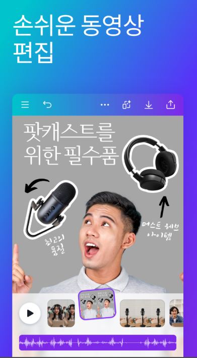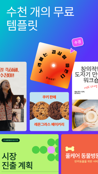 디자인을 편집하고 공유할 수 있습니다. 완성된 디자인은 이미지, PDF, 영상 등 다양한 형식으로 저장하거나 SNS와 온라인 플랫폼에 바로 게시할 수 있어